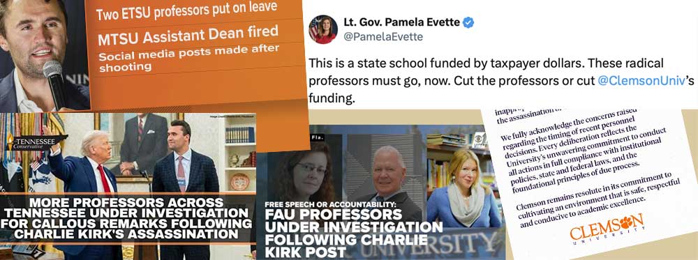 If there was any doubt about the intensity of the spotlight on faculty social media accounts, the wave of investigations and firings following the murder of Charlie Kirk surely erased it. At least a dozen faculty nationwide faced termination or discipline in the two weeks following Kirk's death, with conservative online influencers and politicians sharing screenshots to amplify pressure. One tenured professor at Austin Peay State University was fired, later reinstated following a successful lawsuit. But many without tenure were fired or suspended only to see their contracts unrenewed.